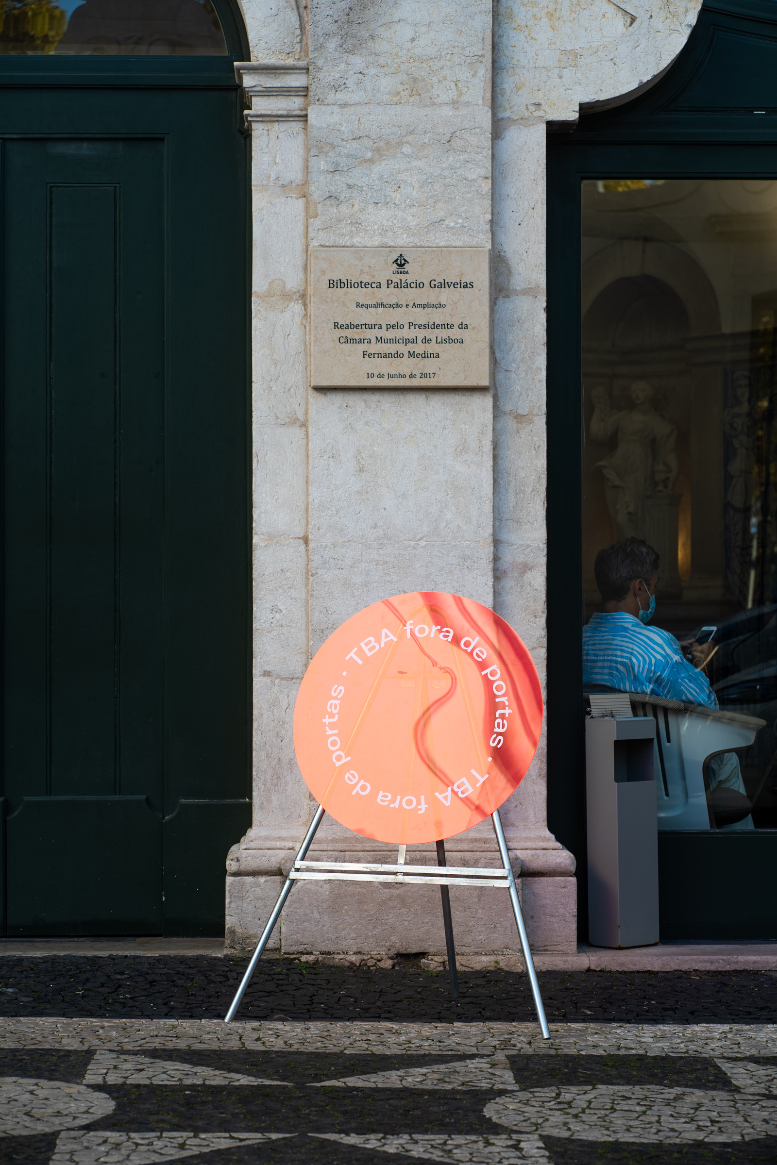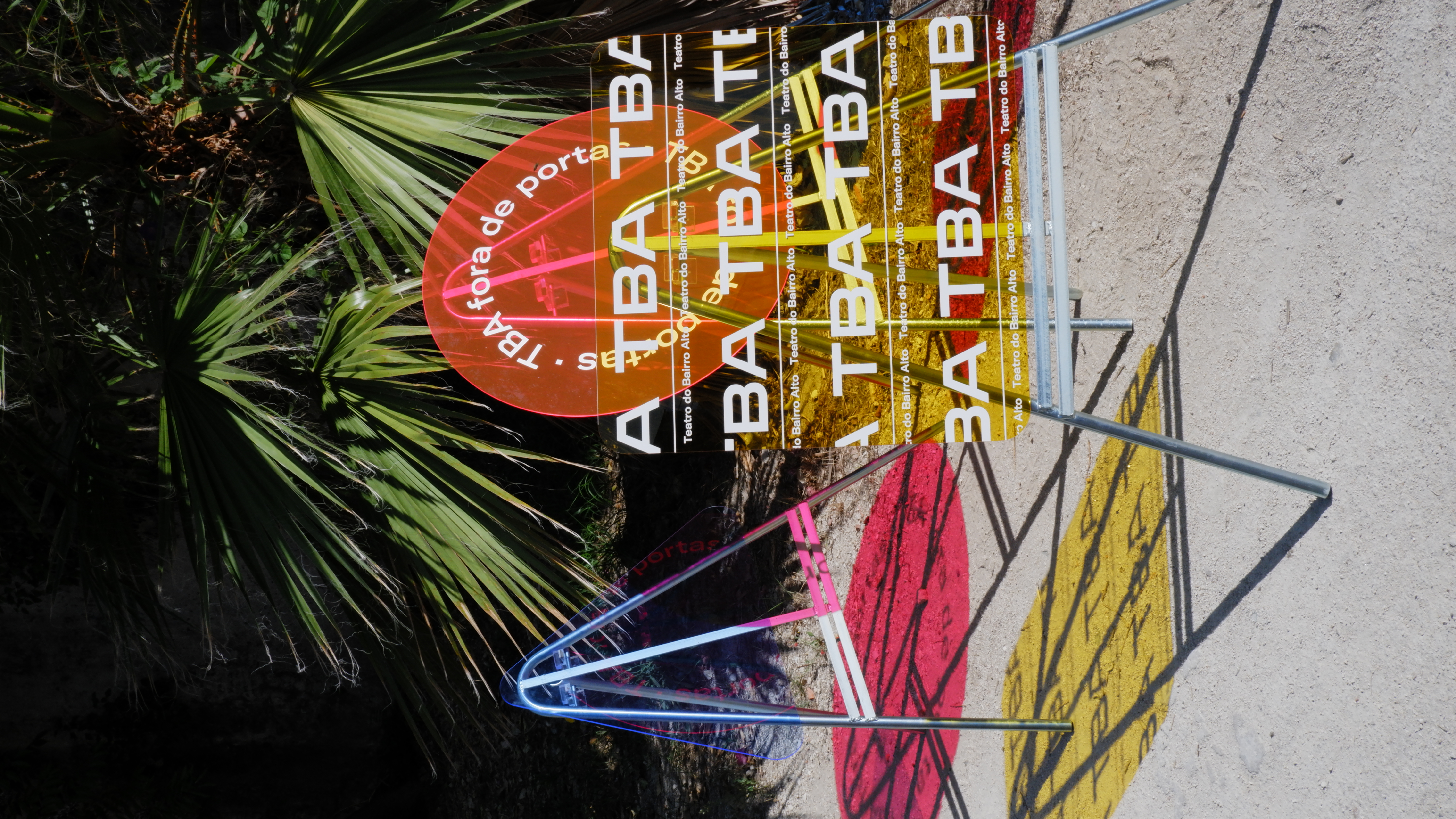 The portable signage developed for TBA (Teatro do Bairro Alto) aims at mark the spaces where the theatre carries events happening outside their premises.
