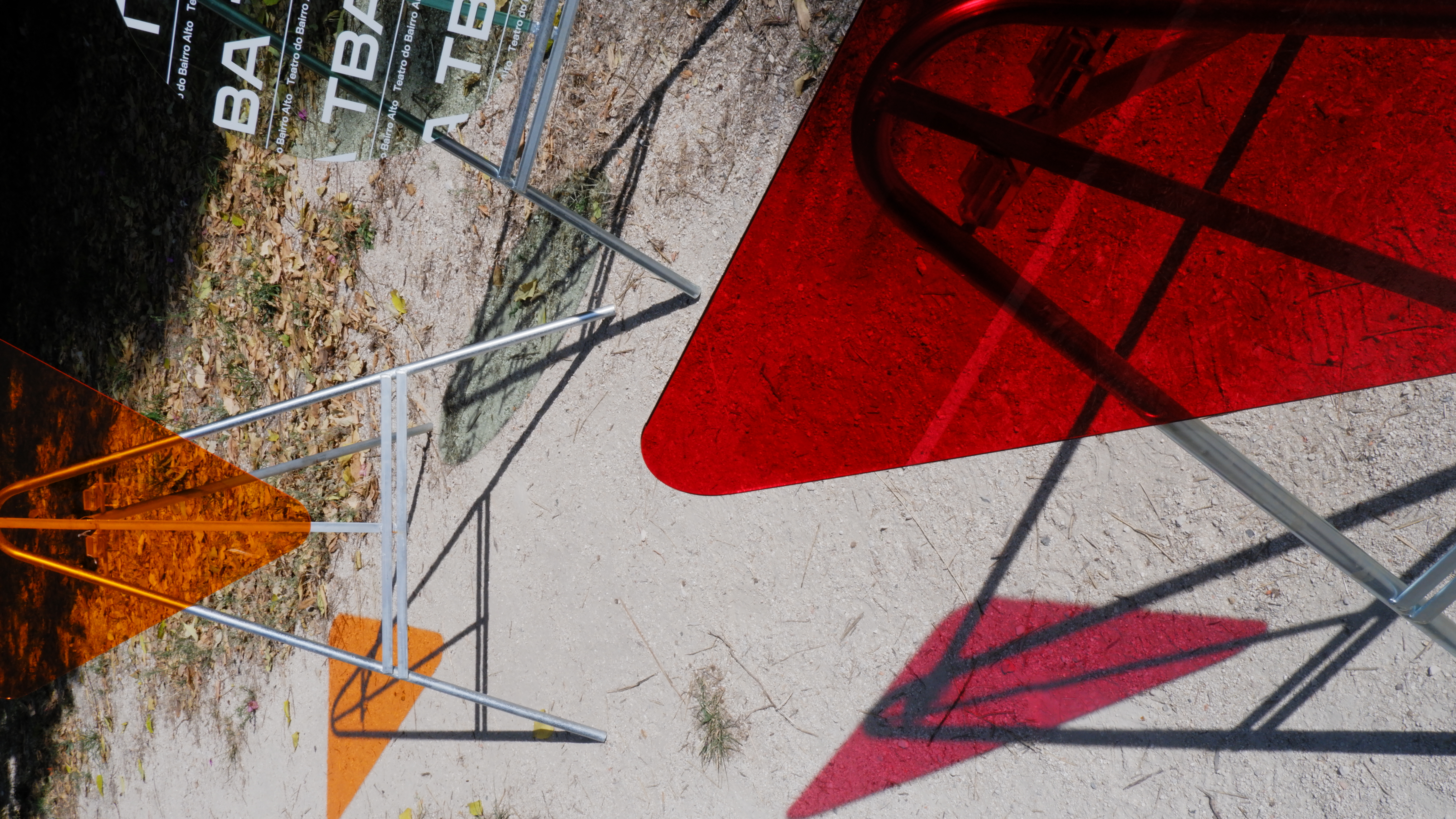 A proposta tem como referência os sinais de trânsito provisórios, apoiados em tripés dobráveis, enquanto elementos que sinalizam e informam de forma clara o seu significado. A sua forma é mantida, mas o material em que são executados é substituído por acrílico colorido, permitindo criar novas relações de transparência, luz e sombra com os lugares onde são colocados.